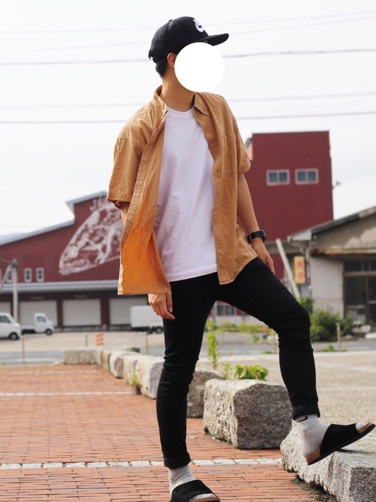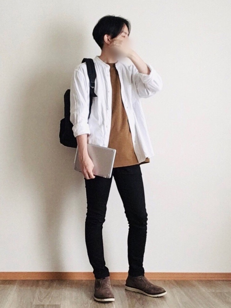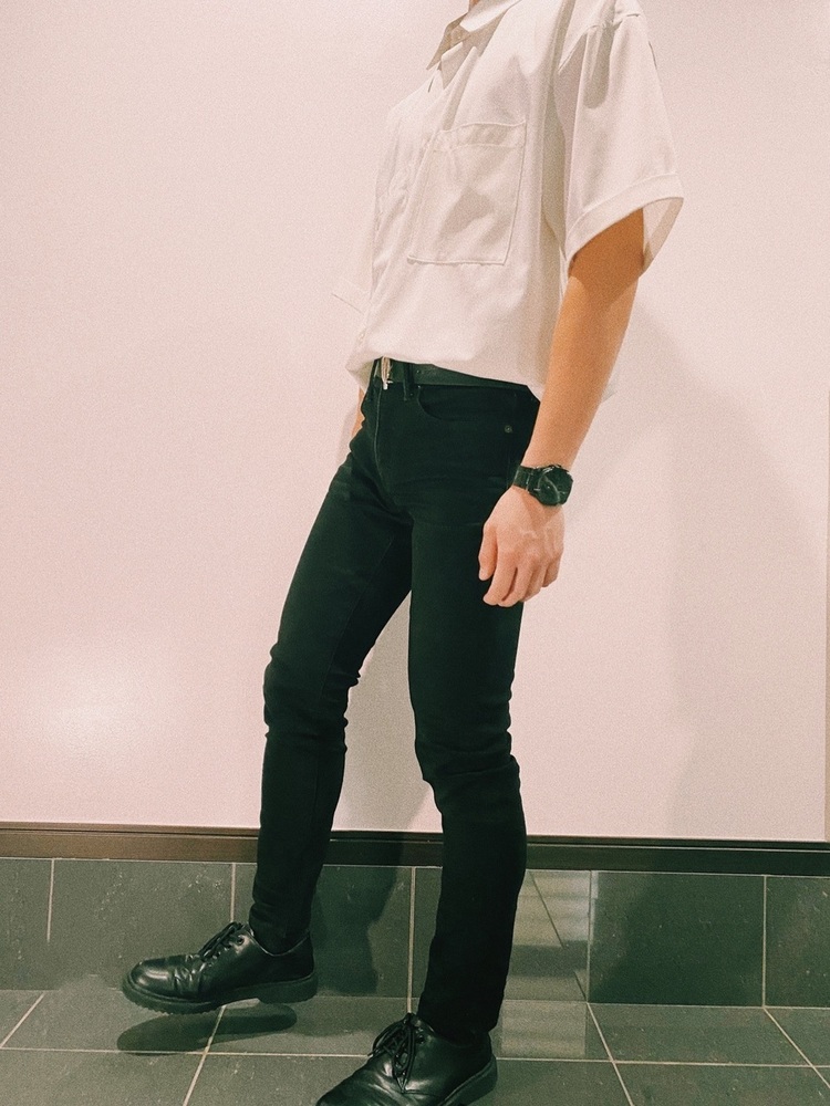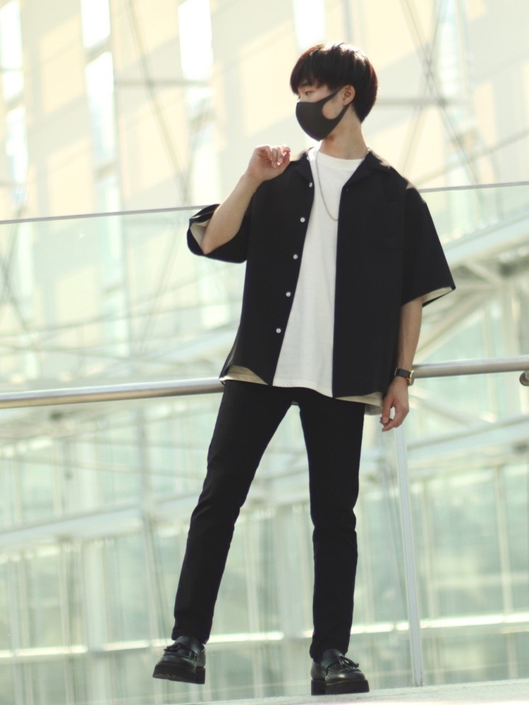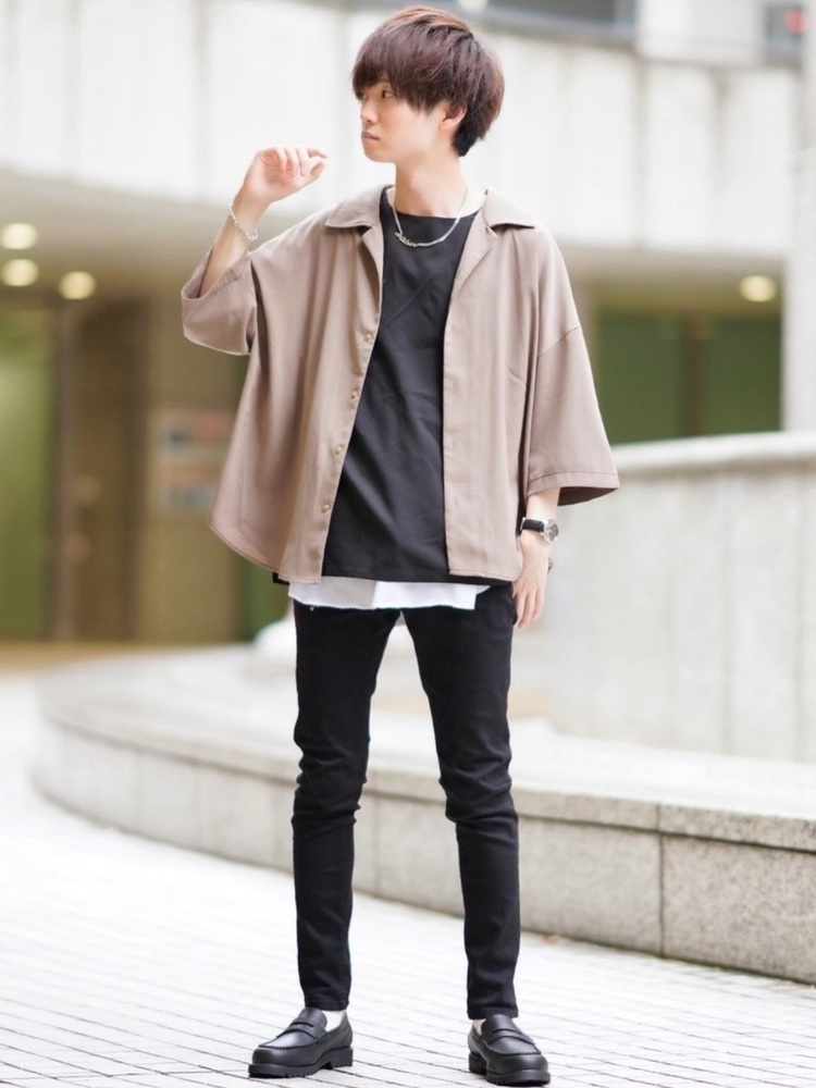 黒スキニーに真っ白なシャツを重ね着したシンプルかつおしゃれなメンズコーデです。インナーの半袖Tシャツを濃いめの色にして、上から白を重ね着することでメリハリがつきます。また、靴とインナーを同系色でまとめているのもポイントです。落ち着いた雰囲気が演出できるので、大学生から社会人まで幅広く真似しやすいコーディネートとなっています。