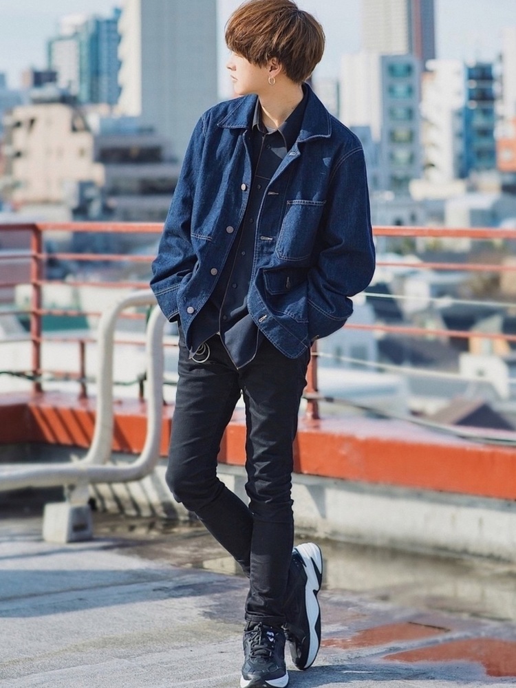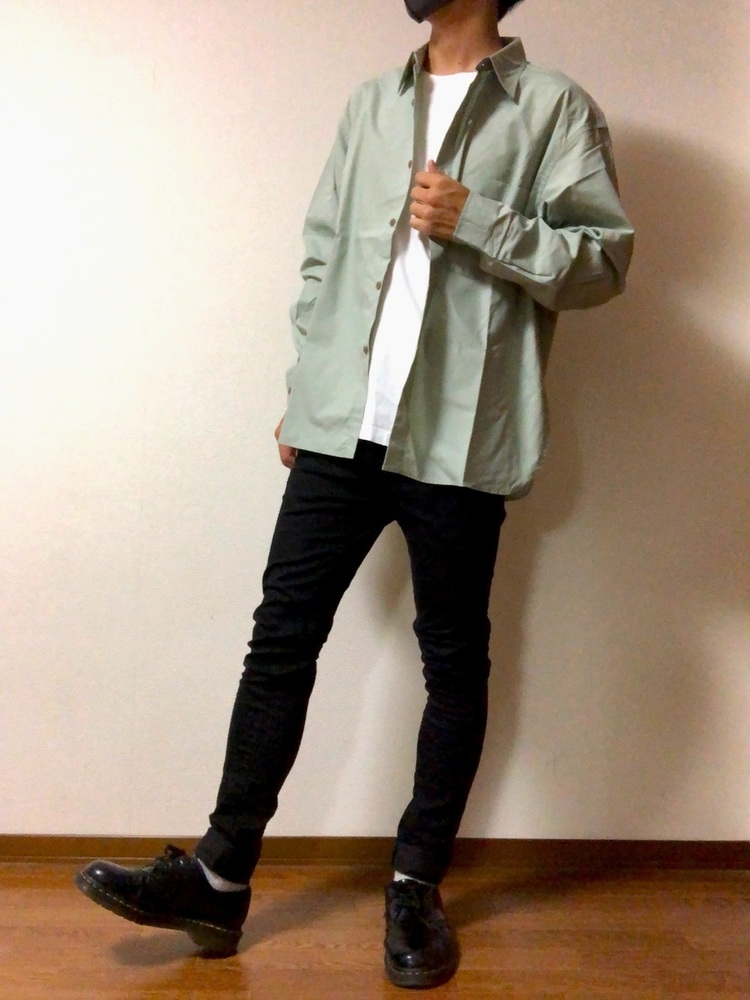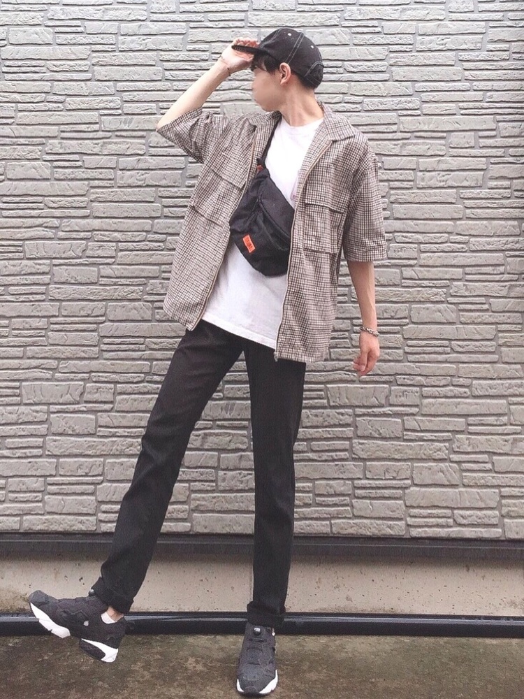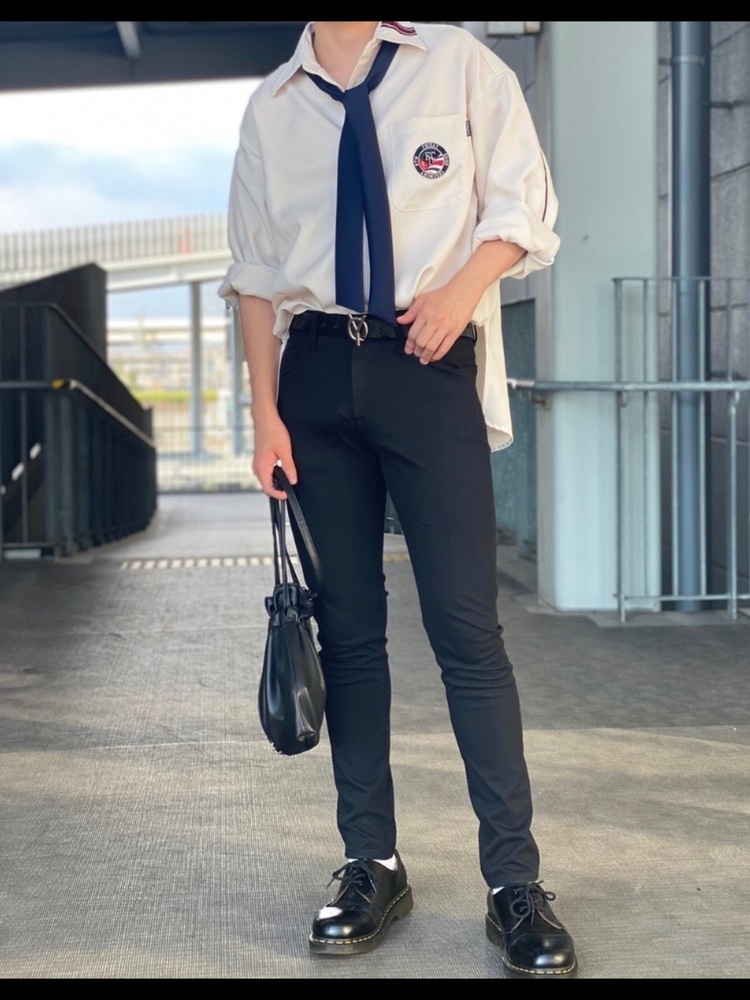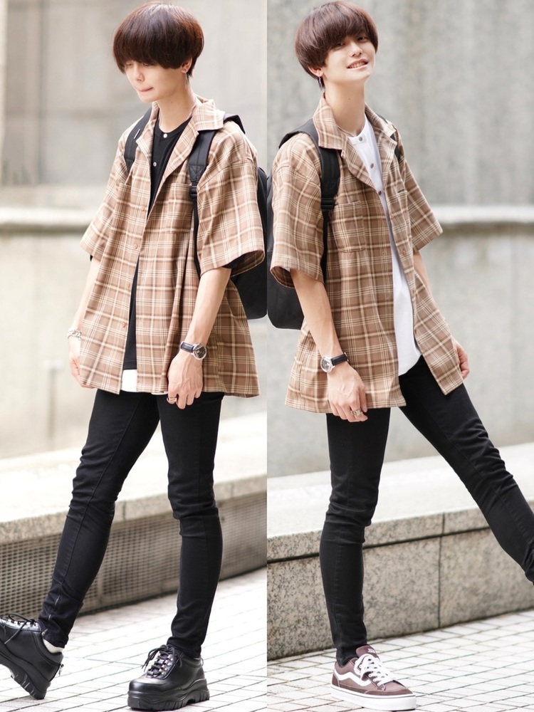 黒スキニーに真っ白なシャツを重ね着したシンプルかつおしゃれなメンズコーデです。インナーの半袖Tシャツを濃いめの色にして、上から白を重ね着することでメリハリがつきます。また、靴とインナーを同系色でまとめているのもポイントです。落ち着いた雰囲気が演出できるので、大学生から社会人まで幅広く真似しやすいコーディネートとなっています。