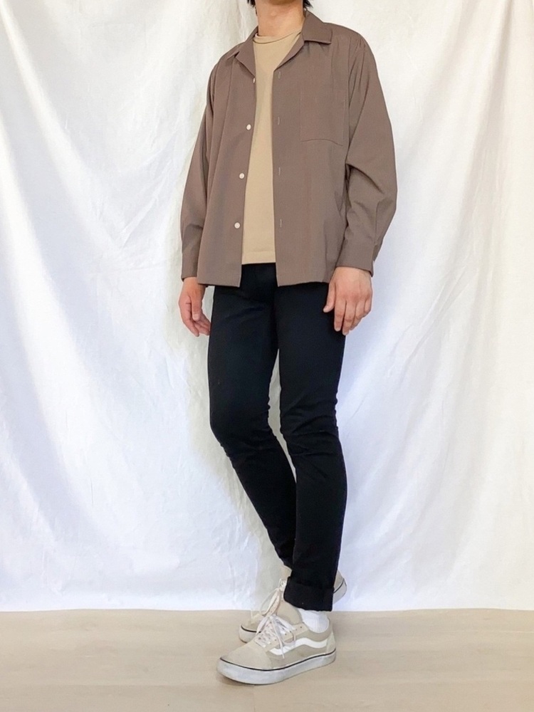 黒スキニー以外を同系色でまとめたワントーンコーデで、大人っぽくおしゃれに着こなしています。半袖Tシャツに重ね着することでおしゃれ度がアップ。ワントーンコーデは大学生に特に人気ですが、どの年代でも簡単に着こなしができるのでおすすめです。ワントーンの中でもベージュは秋感がでるので、夏の肌寒い日に着てみてください。