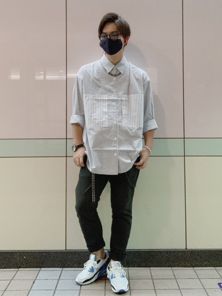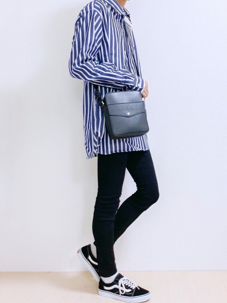 黒スキニーに少し大きめのストライプシャツを合わせた、きれいめのメンズコーデです。爽やかな青が夏を感じさせ、靴をスニーカーにすることでカジュアル感も演出しています。ストライプシャツは一枚でも着用できますが、より寒くなると重ね着などもできるので着回し抜群のアイテムです。