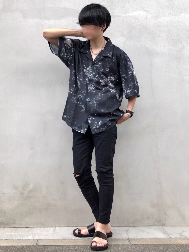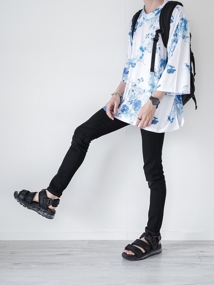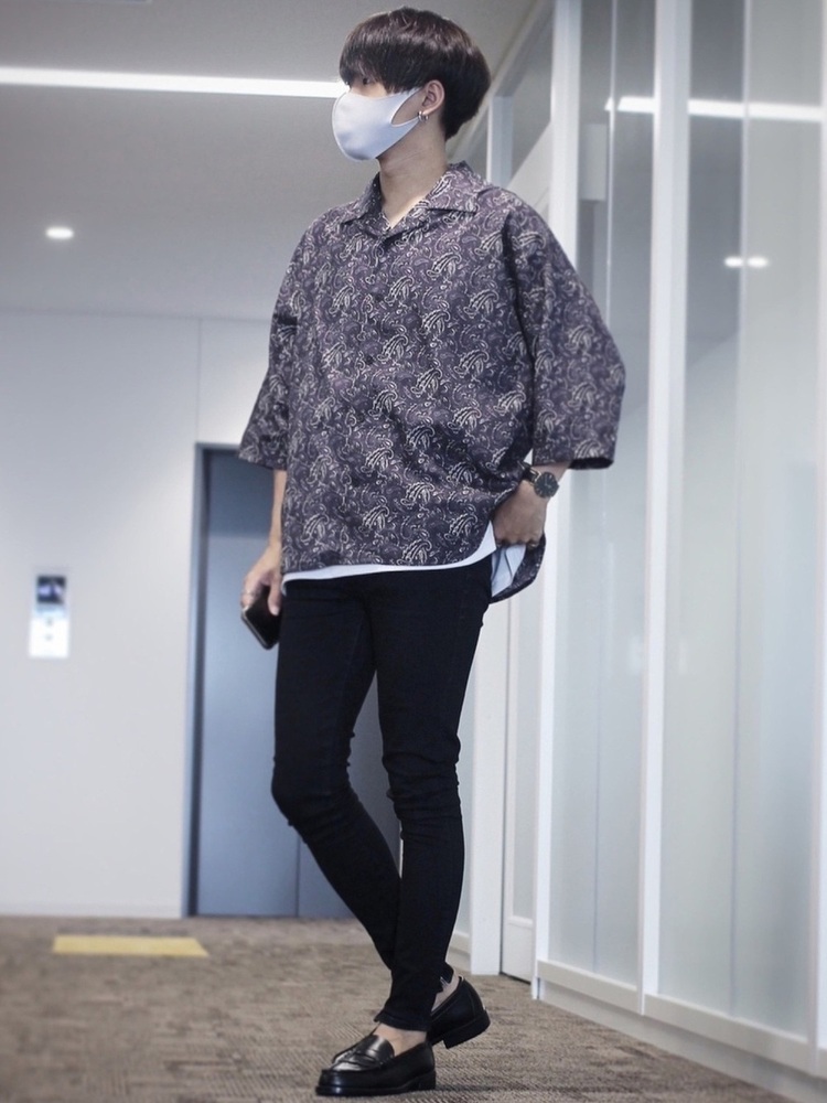 このコーディネートは、黒スキニーに柄がある派手めのシャツを組み合わせています。少しトップスを大きめにすることでスタイルアップ効果も抜群。ちらっと見えるインナーの白シャツと、足もとの肌色がおしゃれポイントになっています。シルエットがきれいにまとまっていて全体的なバランスが整ったメンズコーデです。