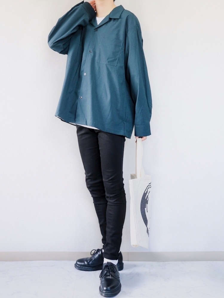 黒スキニーに無地のカラーシャツを合わせてシンプルに仕上げています。アクセントのカラーシャツを黒スキニーに合わせることで、大人っぽい落ち着いた雰囲気が増します。トートバッグがカジュアルな雰囲気をかもし出し、全体のバランスを整えたコーディネートです。ゆったりしたラフなシルエットのトップスは女子ウケも狙えます。