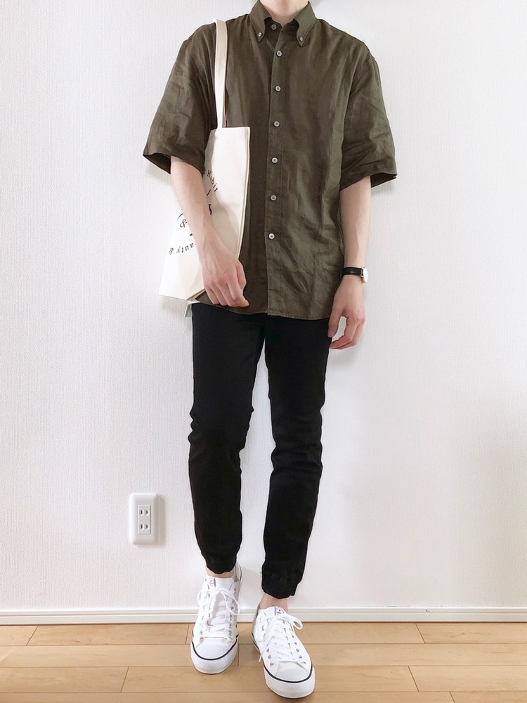 半袖のリネンシャツと組み合わせることで涼しさをアップ。トートバッグとスニーカーを白にすることで、全体の色味が暗すぎないよう工夫されています。ワンポイントとして時計をつけることもおしゃれ度が増すのでおすすめです。ロールアップして丈を短くし、スニーカーもローカットのものを選びましょう。