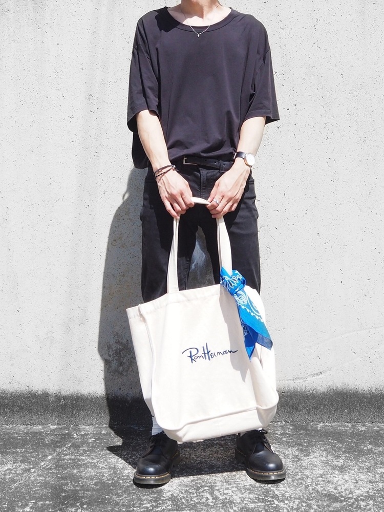 オールブラックコーデはおしゃれ初心者でも真似しやすいメンズコーデです。白のトートバッグに青色のバンダナをつけることで、夏感をプラスしています。カットインすることでよりスタイルがよく見えることもポイントです。時計などのアクセサリーをつけることで、こなれ感を演出できます。