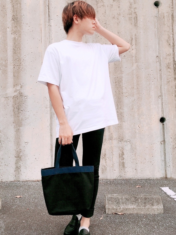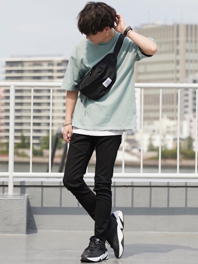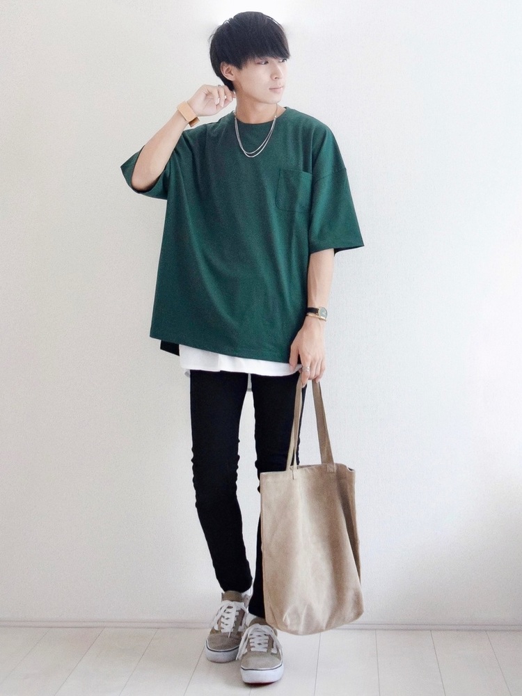 アクセントのある色味のTシャツに黒スキニーを合わせた人気メンズコーデです。大きめシルエットのトップスが特徴で、全体のバランスがよく好印象間違いなし。トートバッグやネックレスなどの小物アイテムでおしゃれ度アップを狙いましょう。白のインナーが少し見えてもかっこいいですが、暑すぎるときは上の1枚だけでもおしゃれに着こなしできます。