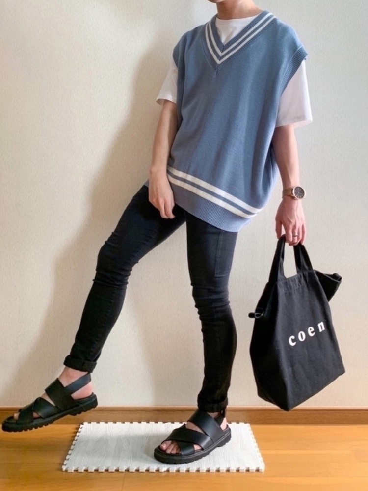 黒スキニーとニットベストを組み合わせることで、爽やか系カジュアルコーデの完成です。ふんわりとした雰囲気は高い女子ウケを狙えます。足もとの肌を見せて涼しげな印象をもたせるため、スニーカーを履く場合はロールアップするなどして丈感に注意しましょう。ニット系のアイテムでも中に半袖を合わせれば、夏にぴったりの黒スキニーコーデになります。