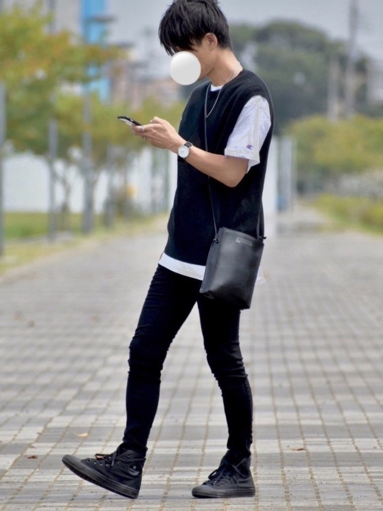 黒スキニーとドットシャツの組み合わせは男子でもおしゃれに着こなしできます。シンプルでコーディネートしやすいのでおしゃれ初心者におすすめ。ジャストサイズのトップスと合わせることで、きれいな雰囲気に仕上げることができます。1枚で着用できるので真夏の暑い日でも過ごしやすいメンズコーデです。