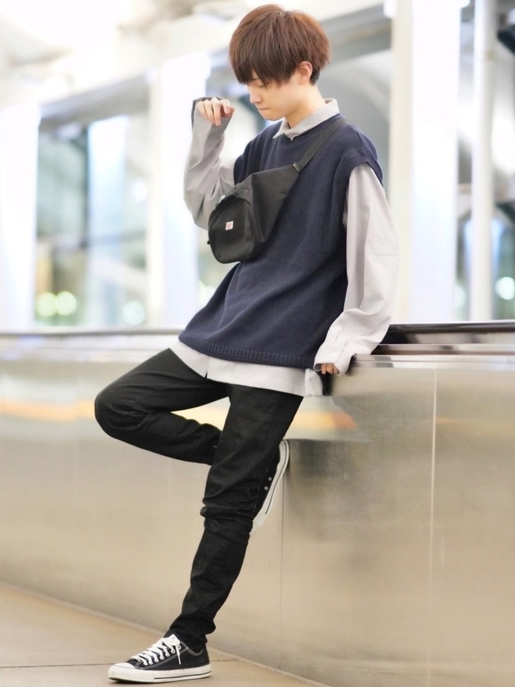肌寒い日におすすめの重ね着メンズコーデです。ベストの重ね着は可愛らしい雰囲気も出せて女子ウケが狙えます。少し秋の雰囲気を感じさせる色味もおしゃれに見えるポイントです。丈が短かったりロールアップして着用する場合は、白靴下で少し明るくするとこなれ感アップ。革靴系のシューズも相性がいいのでおすすめです。