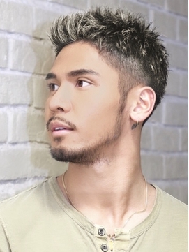 サイドはおでこのラインまですっきりとツーブロックに刈り上げ。バックもグラデーションに繋がるように刈り上げていきます。トップは短くカット。黒髪のままでもかっこいいですが、ハイライトをいれて髪の毛に動きを出してもOK。