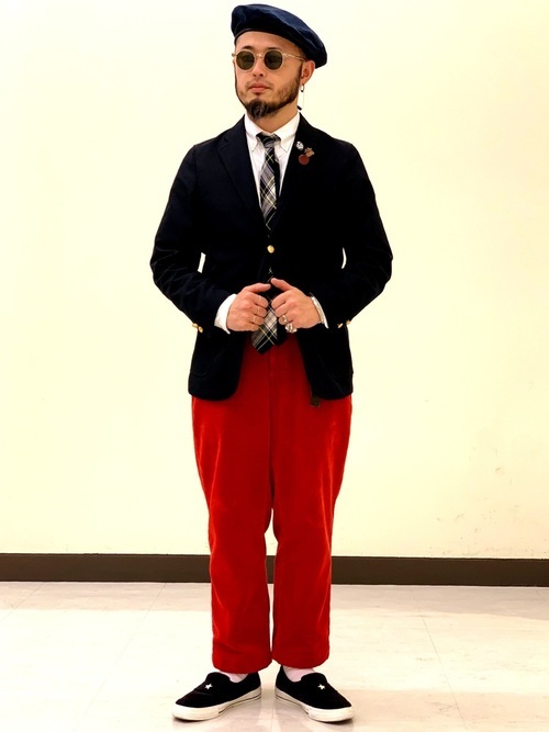 インパクトのある赤のコーデュロイパンツを、コーデのアクセントとして上手に使ったコーデです。テーラードジャケットとネクタイの組み合わせはトラッド感があり、コーデュロイパンツ以外のアイテムをシックな色合いでまとめることでバランスの良い着こなしに。