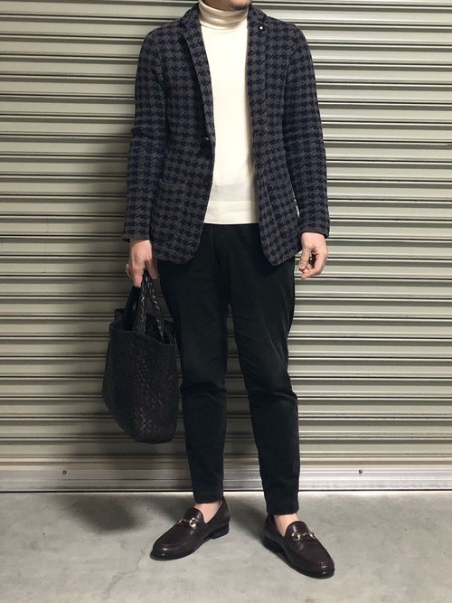 ブルーのコーデュロイ生地のセットアップは、上品でスタイリッシュな印象のコーデになります。インナーに白のタートルネックを重ねて寒色系のカラーでまとめていますが、コーデュロイの素材が温かい印象を与えるので、秋冬でも違和感なく着こなすことができるスタイルです。靴には黒の革靴を合わせてコーデを引き締めているのもポイントです。