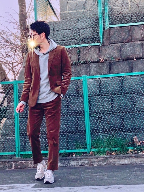 ナノユニバースのコーデュロイ素材を使ったセットアップ。ブラウンは落ち着いた雰囲気がありますが、コーデュロイ生地の光沢感が華やかな大人の着こなしに仕上げています。インナーにパーカー、足元にスニーカーを合わせることでぬけ感のあるスポーティーカジュアルコーデの完成です。