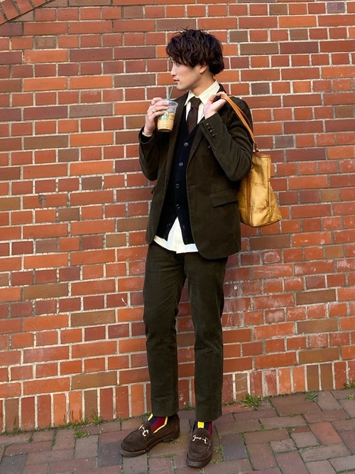 ナノユニバースのグリーンのコーデュロイ生地を使ったセットアップです。インナーにカーディガンを使い、ネクタイも組み合わせて全体的にクラシカルなコーデですが、シャツは外に出すなどあえてラフな着方をすることでぬけ感を演出。