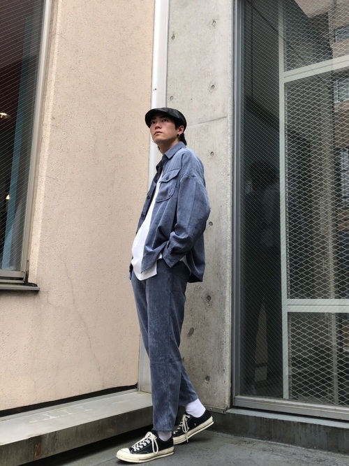 水色のコーデュロイ生地を使ったセットアップコーデです。トップスはコーデュロイ生地のCPOシャツに、ボトムスはテーパードデザインのコーデュロイパンツを合わせていて、きれいめのカジュアルコーデに仕上がっています。トップスはラフに着こなしても、ボトムスは短め丈ですっきりとさせることでバランスの取れたスタイルに。