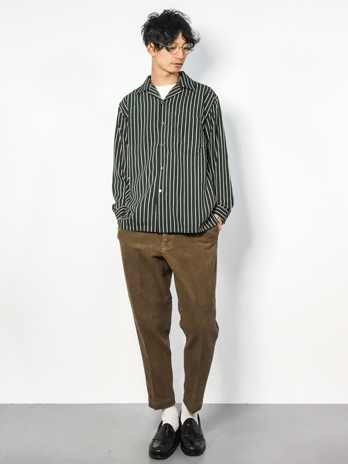 ブラウンのコーデュロイパンツと紺のストライプシャツのコーデ。ストライプシャツはオープンカラーなので堅苦しい雰囲気を感じさせず、爽やかな着こなしになっています。ブラウンのコーデュロイパンツとの相性も良く、きれいめの大人カジュアルなコーデに仕上がっています。インナーや靴下を白で合わせてコーデの差し色にしているのもポイントです。