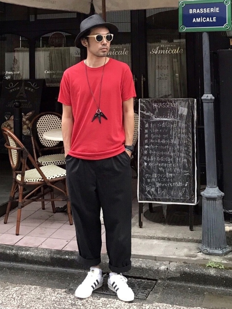 シンプルな無地の赤いTシャツにワイドチノパンとハットを合わせたメンズコーデです。黒いワイドパンツも裾が足首が見えるくらいの丈感に2、3回ロールアップすることで抜け感が出ています。サングラスやネックレス、スニーカー等の小物がアクセントになったおしゃれな着こなしですね。