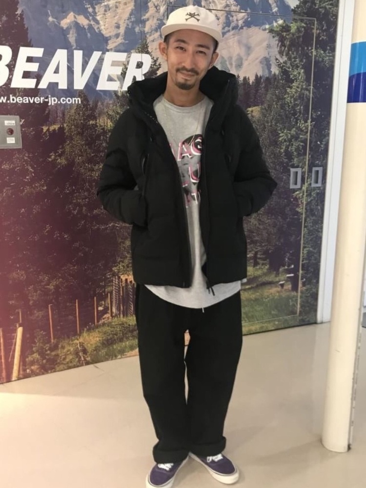 ダウンジャケット×グラフィックTシャツ×ワイドパンツ