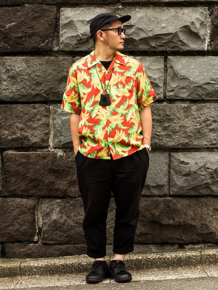 一際目立つ柄シャツにオーソドックスな黒のワイドチノパンを合わせたメンズコーデです。柄シャツのインパクト分、他のアイテムを黒に統一することでバランスの取れた着こなしとなっています。ワイドパンツもテーパードシルエットに加えてロールアップすると一味違ったシルエットが楽しめますね。