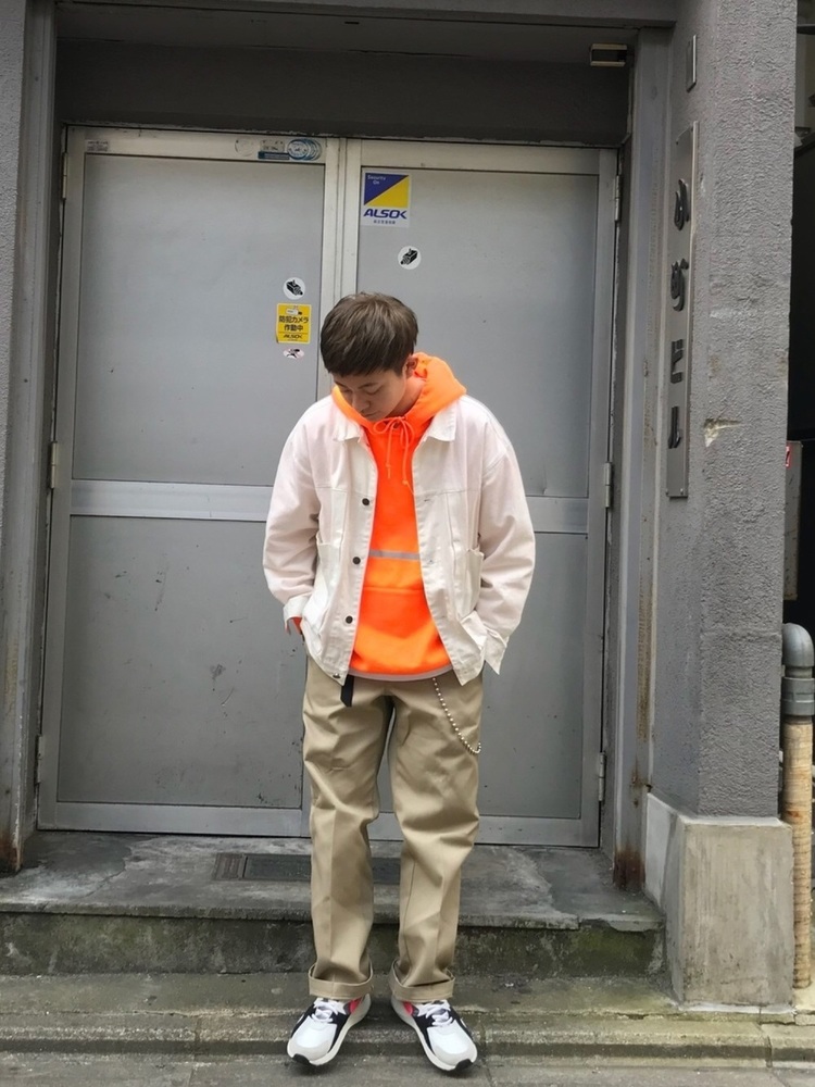 白いデニムジャケットにパーカーとワイドパンツを合わせたメンズコーデです。白のジャケットにオレンジのネオンカラーが目を引くスタイリングですね。さりげない1回ロールアップでこなれ感のある着こなしとなっています。幅も太すぎず細すぎずちょうど良いバランスです。