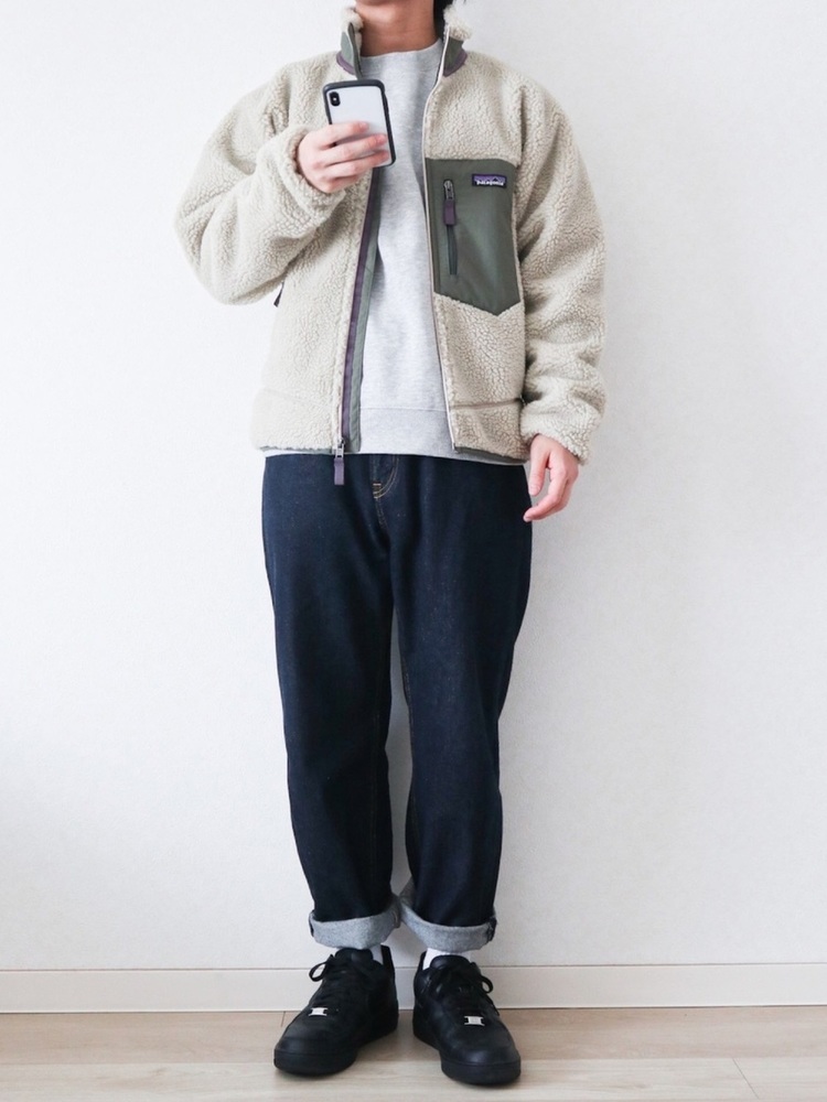 ボアブルゾンにスエットとワイドパンツを合わせたメンズコーデです。ボアジャケットがボリューミィですが裾も2、3回しっかりロールアップして足元の靴下が見えることで調和が取れていますね。ロールアップするとアウトドアでも裾が汚れにくいというメリットもあります。