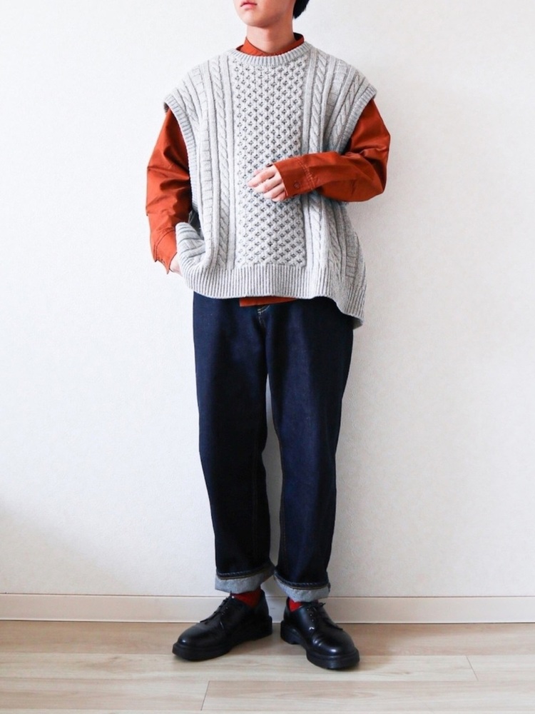 カラーシャツにニットベストとワイドパンツを合わせたおしゃれなメンズコーデです。レンガ色のシャツにデニムのインディゴが対照的な配色の着こなしですね。足元を1回ラフにロールアップして裾から赤い靴下が見えることでバランスがとれています。