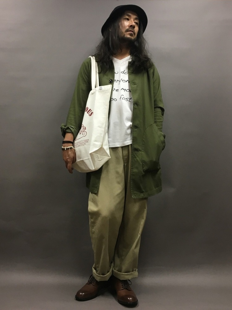 ハットにミリタリーカラーのショップコートとワイドチノパンを合わせたメンズコーデです。ロング丈のシャツがロールアップしたワイドパンツと良い丈バランスになっています。アウターのカーキとチノパンのベージュで合わせた落ち着いた配色が印象的な着こなしです。バッグやハットといった小物合わせもおしゃれポイントですね。