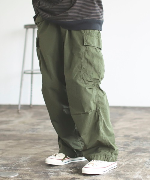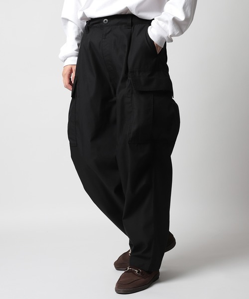 ミリタリーパンツの定番モデルであるM-65カーゴパンツをベースとしたワイドパンツ。やや丸みのあるバルーンシルエットで足元ロールアップもしやすく、タックも入っているため自然なワイドシルエットとなっています。ゆったりとした快適性もトレンド感も備えたアイテムです。
