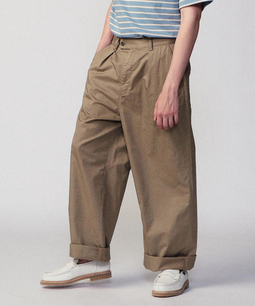 高密度に織り上げられたコットンツイル素材のワイドチノパンツです。フロントにプリーツが施されているので腰回りがゆったりしたストレートシルエットになっています。ビンテージのペインターパンツがデザインのベースととなっていて、後部のシンチバックもポイントです。