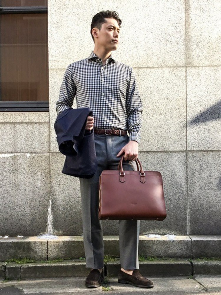 羽織ってよし、持ち運んでよしのジャージージャケット。手に持った時もこのコーデのように綺麗に畳んであると好印象です。ブルー系のチェックシャツとグレー系のパンツで落ち着いた色合いの着こなし。革製品によって全体の雰囲気が引き締まり、おしゃれなビジネススタイルになっています。