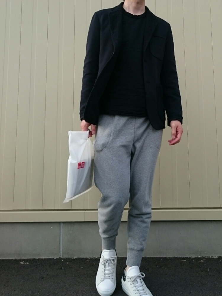 黒のジャージージャケットにラフなスウェットパンツを合わせたメンズコーデ。全体的にストレッチがきいていて着心地がよさそうです。ラフな雰囲気が強めですが、ジャケットがテーラードジャケットなのでルーズさは感じさせません。