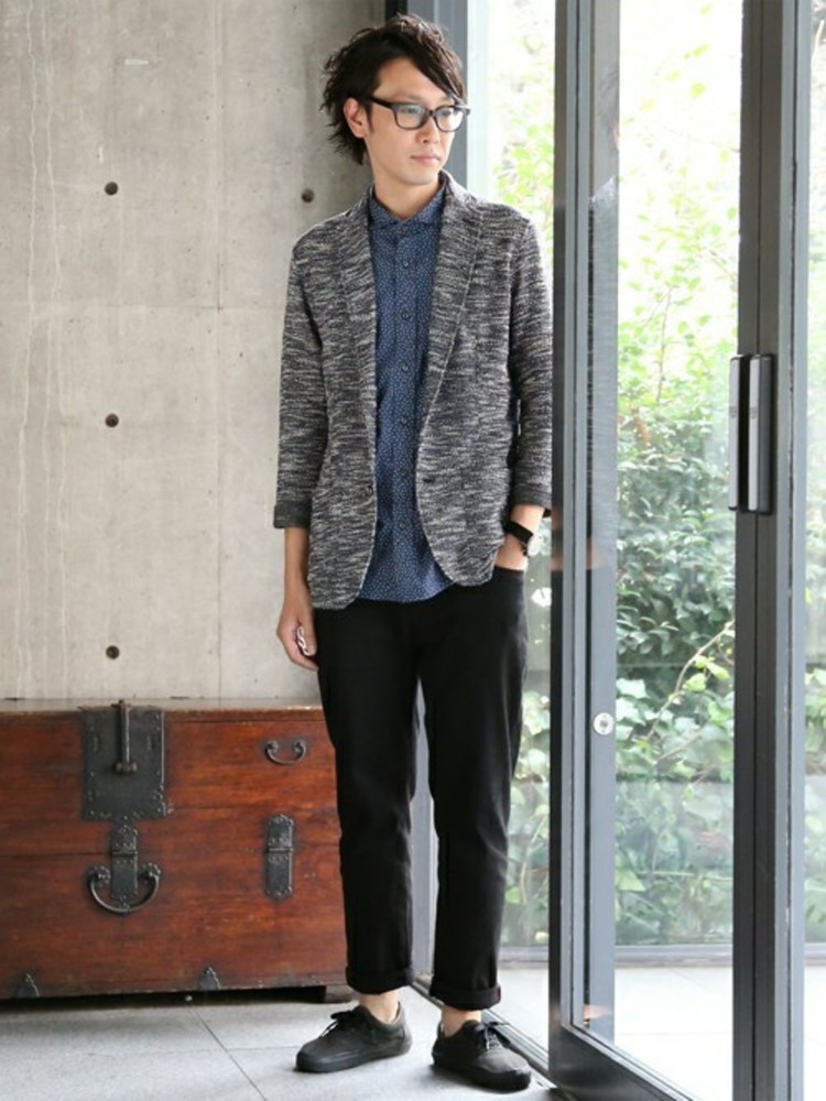 カジュアル感が強い柄入りのジャージージャケットを使ったコーデ。カジュアル感が強いのでビジネスシーンよりはプライベート向きですがおしゃれです。全体的に暗めのトーンなので大人っぽくスマートな雰囲気になっています。