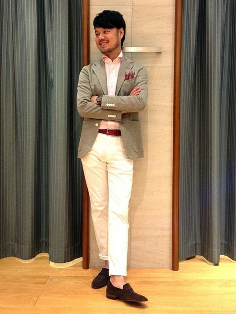 グリーン系のジャージージャケットにピンクのYシャツを合わせたメンズコーデです。少し難易度が高めの着こなしですが、こちらの画像では上手く着こなしています。無難な着こなしに飽きたら挑戦してみてください。