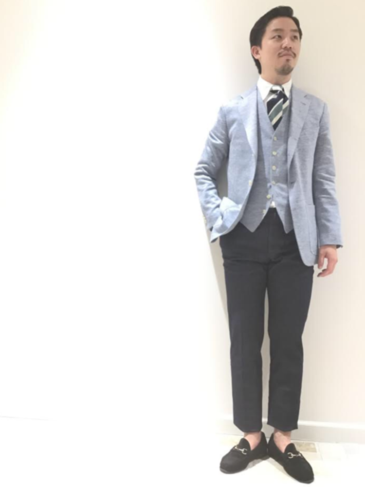 クールビズ期間にネクタイを締めたくない方はジャケットと同じ生地でできたベストを合わせると雰囲気をかっちりさせることが出来ます。夏なので暑苦しく見えないベストを選ぶのが良いでしょう。