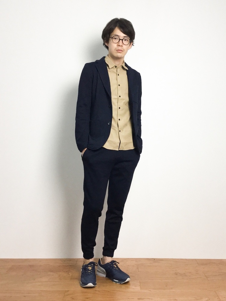 ホワイト系のシャツにネイビージャージージャケットを羽織ったメンズコーデです。ジャケットとパンツをネイビー系、シャツとスニーカーをホワイト系で揃えていてシンプルで落ち着いた雰囲気になっています。スニーカーや襟無しのシャツを合わせることでカジュアルな印象もプラス。