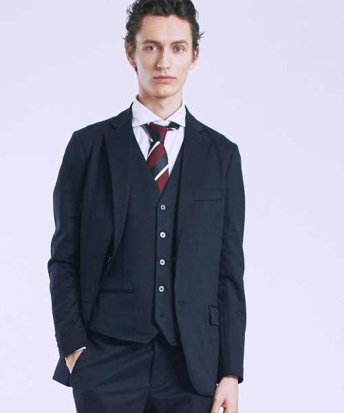 通常のジャケットはウール素材を織った生地で作られていますがジャージージャケットはこの編み方で編まれた生地で作られています。ポリエステル繊維が使われていることが多いです。特に緩めに編まれたジャージー素材は通気性が抜群で夏にぴったり。他にもシワになりにくい、ストレッチがきくという特徴があります。