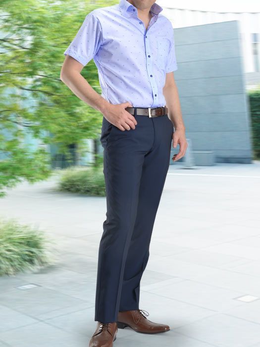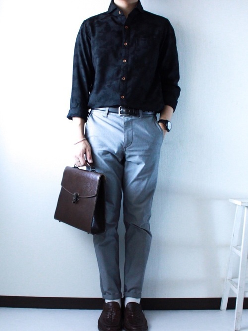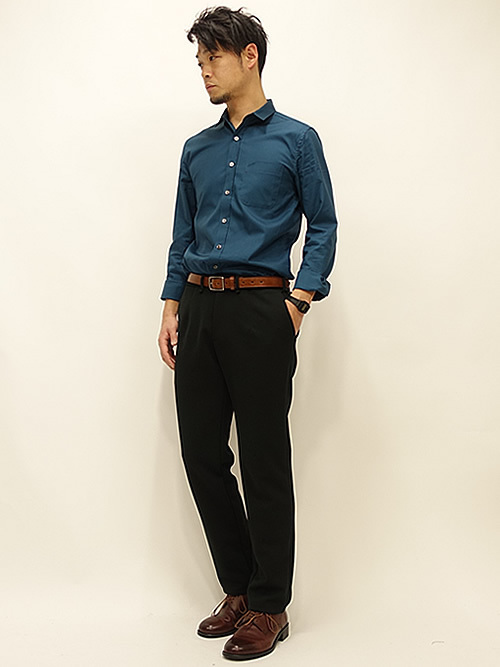ブルーのシャツとブラックのパンツで男性らしいカラーリングを大人っぽく仕上げたメンズコーデ。ベルトと革靴でブラウンをプラスすることで、全体のカラーをぼんやりとさせず、引き締めています。