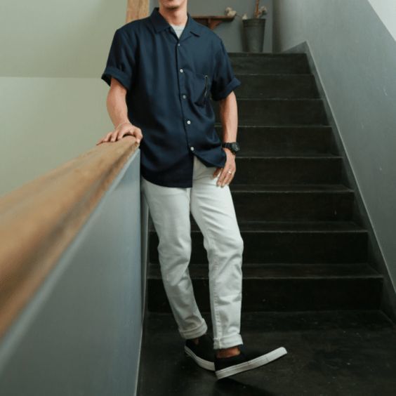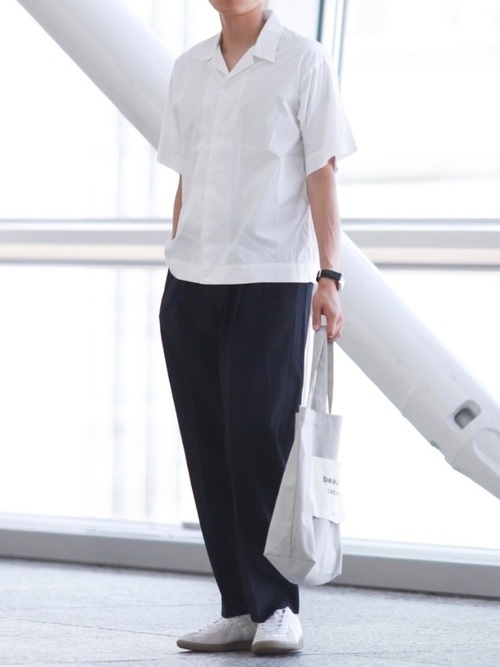オープンカラーシャツをきちんとボタンを留めて着用したメンズコーデです。襟元がオープンカラーになっているので抜け感があるのが特徴。トップスとシューズのカラーを合わせることで、黒のボトムスでもすっきりと軽やかに見せることに成功しています。