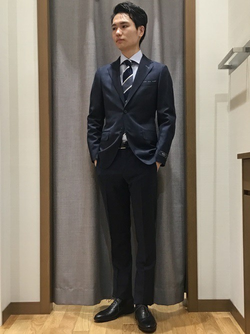 襟の開きが大きなワイドカラーシャツはネクタイともよく調和します。特に太目のネクタイを付けても違和感のないのが特徴のワイドカラー。こちらはスーツと同系色のネクタイをセレクトしたメンズコーデ。ネイビーの面積が大きくなり、重く見えそうなコーデですがワイドカラーシャツをセレクトしたことで、顔まわりがすっきりと見えています。