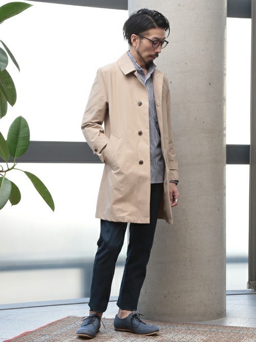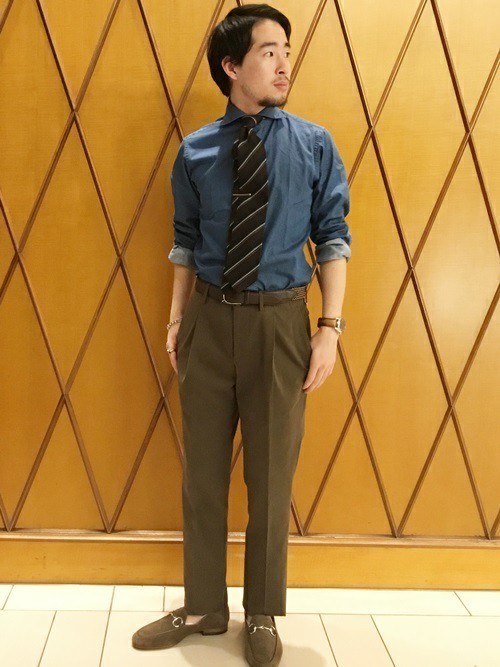 同系色できれいにまとめたメンズコーデはカジュアル感もありつつ、ビジネスにも応用できるスタイル。こちらのように第一ボタンをあければ首が長く見えるので、すっきりとした縦のラインを強調することが可能です。