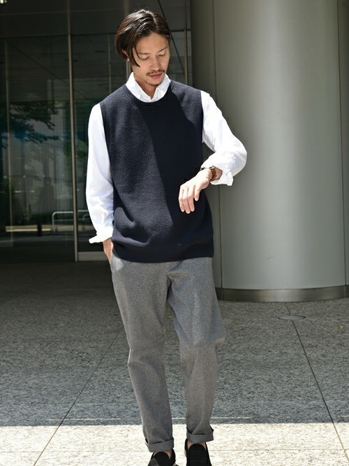 スポーティな印象になりがちなボタンダウンシャツですが、ベストとスラックスを合わせるとこなれた印象に変えることができます。こちらは白のシャツと黒のベストを合わせたメンズコーデ。パンツも同系色で合わせたワントーンコーデは街中でも浮くことなくおしゃれ見えします。