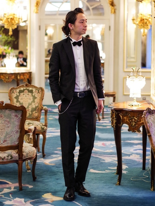 ウィングカラーシャツはきれいめに着こなすのが鉄則ですが、こちらのように少しカジュアルダウンするのもとてもおしゃれです。結婚式などフォーマルな場で着用するウィングカラーシャツなので、カジュアルアイテムを取り入れるだけで周りと一気に差をつけることができます。