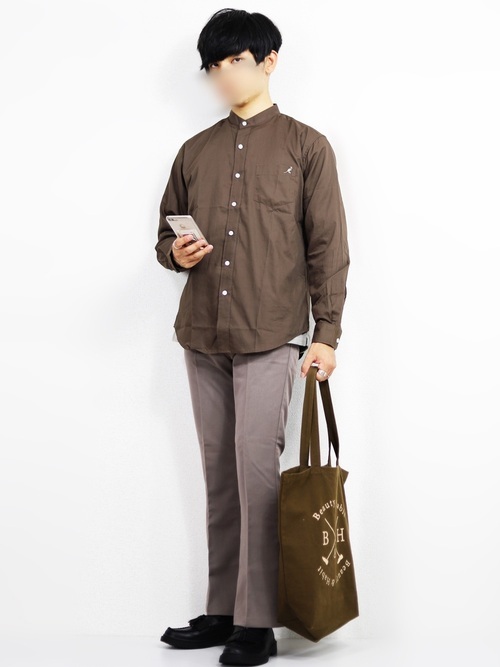 バンドカラーシャツは一枚でさらりと着用するだけでおしゃれに見える便利なアイテム。一枚持っておいて損はありません。こちらはブラウンをベースにしたメンズコーデ。バンドカラーシャツはスラックスとも相性がいいので、きれいめに着こなすのがおすすめです。