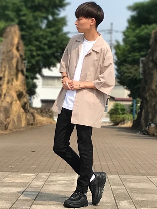 オープンカラーシャツを羽織に使ったメンズコーデです。細身の黒パンツはトレンドですが、それと相性がとても良いのがこのオープンカラーシャツ。羽織に使うことで涼し気かつ軽やかな印象になります。アースカラーを選ぶのがユルさを出す秘訣です。