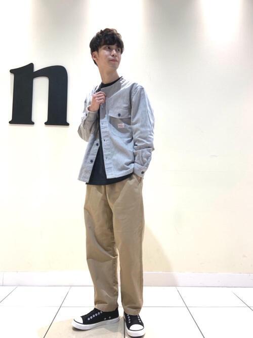 ノーカラーシャツは羽織に使うとこなれ感を出すことができるのでおすすめのアイテム。こちらは淡い色を基調にしたメンズコーデ。靴とインナートップスのカラーを揃えることで、引き締め効果を狙っています。淡い色使いでもぼんやりとぼやけてしまうことがありません。
