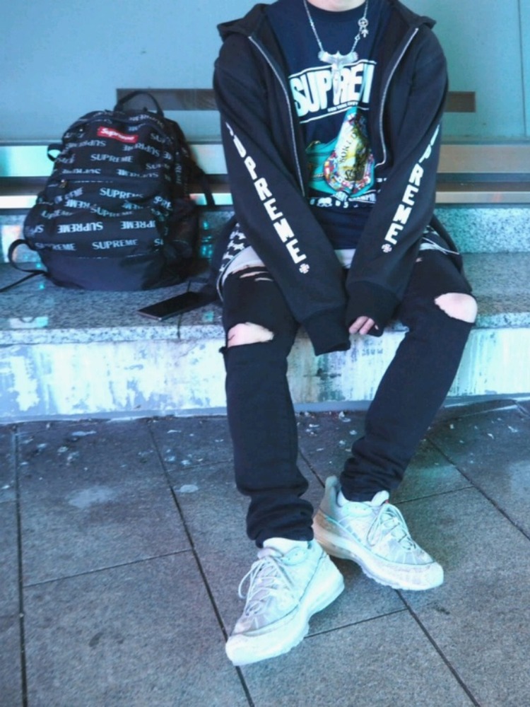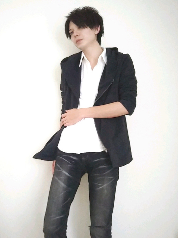 ブラックデニムに白シャツを合わせて、黒パーカーを羽織ったコーデです。白シャツとブラックデニムでかっこいい印象ですが、黒パーカーを合わせることでうまく着崩していますね。