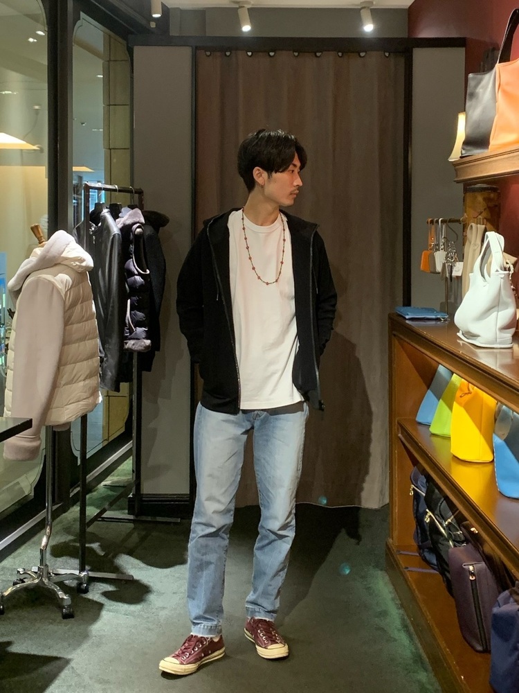 ジップアップの黒パーカーと白Tシャツを組み合わせた王道のパーカーコーデです。白Tシャツがシンプルなので、アクセサリーで首元に動きを付けて、ボトムスもシンプルにデニムであわせています。