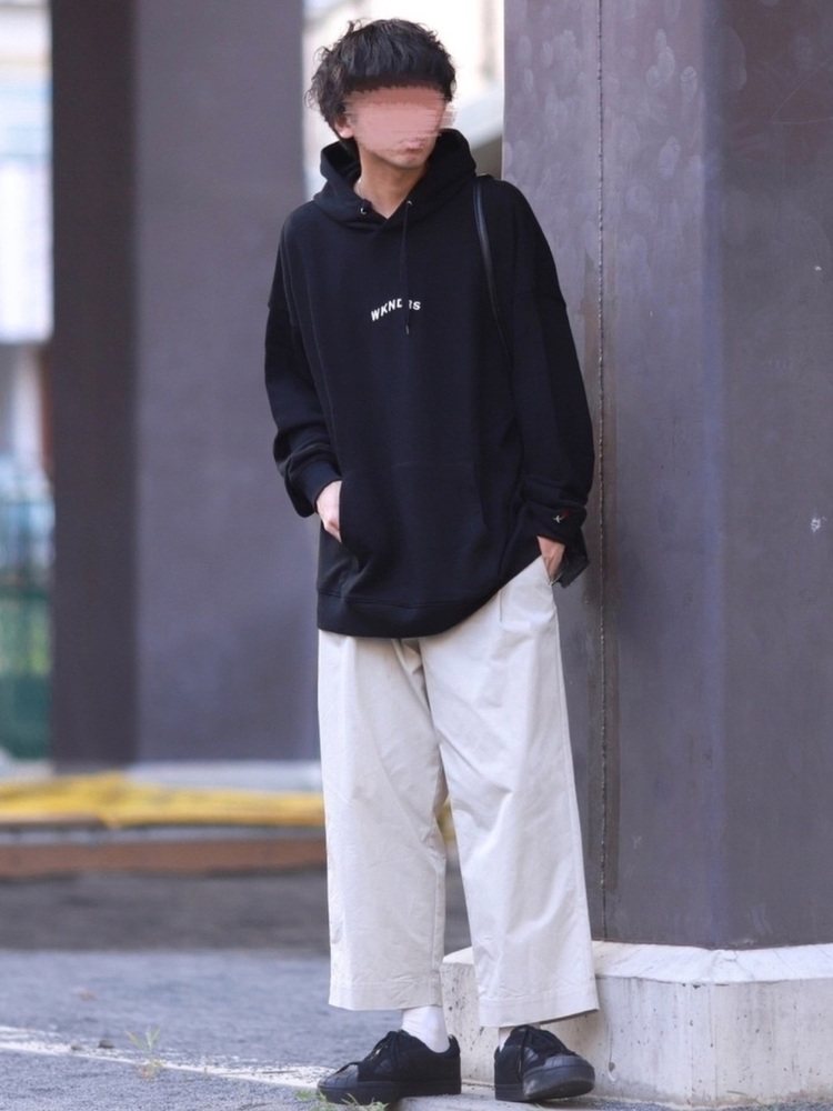 ビッグシルエットの黒パーカーに白のワイドパンツを合わせたコーデです。シューズもバッグも黒で統一しており、メンズコーデのトレンドを抑えたモノトーンの着こなしです。