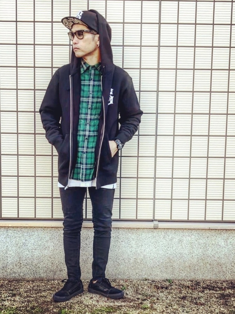 ジップタイプの黒パーカーのインナーにグリーンのチェックシャツを着たコーデです。チェックシャツできちんと感を出しつつ、キャップを合わせることでストリートカジュアルにもなる着こなしです。