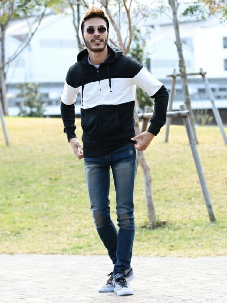 ぴったりサイズの黒パーカーとスキニーデニムを合わせたメンズの大人コーデです。黒パーカーとスキニーパンツの組み合わせは非常にシンプルですが、パーカー自体がデザイン性のある配色で、海外スターのようなお洒落な着こなしです。
