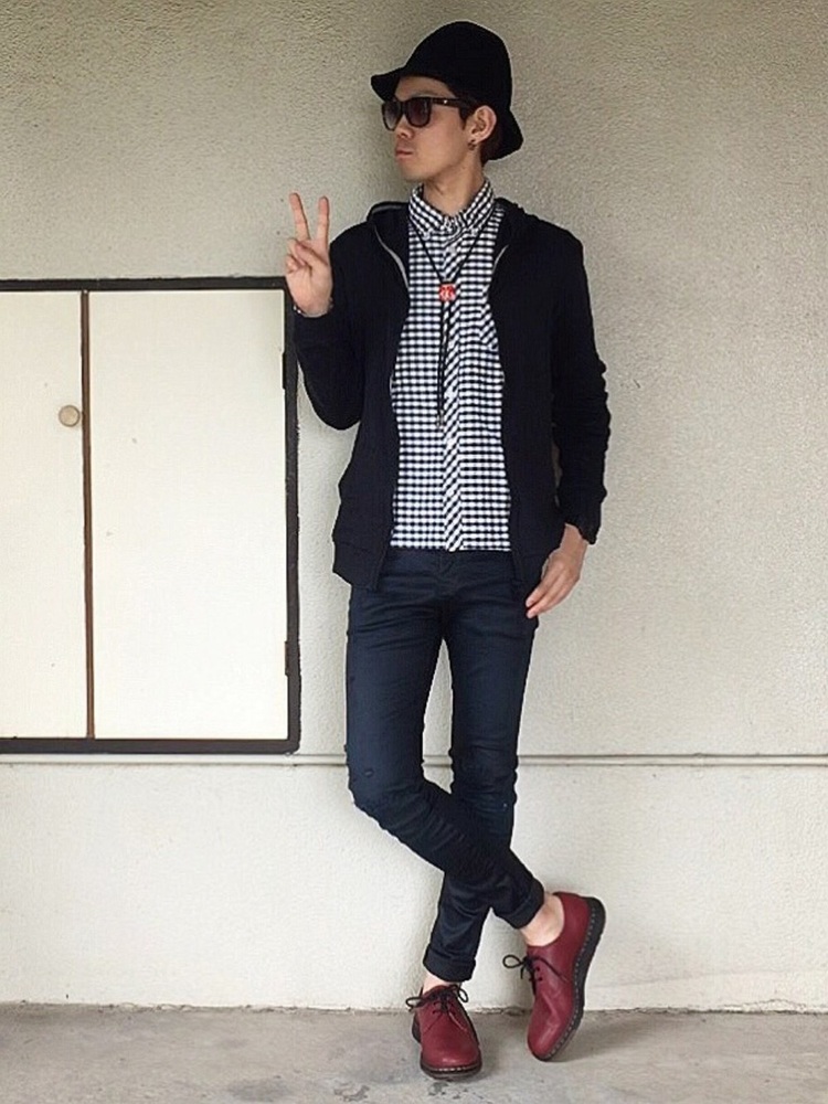 黒ジップアップパーカー×ギンガムチェックシャツ